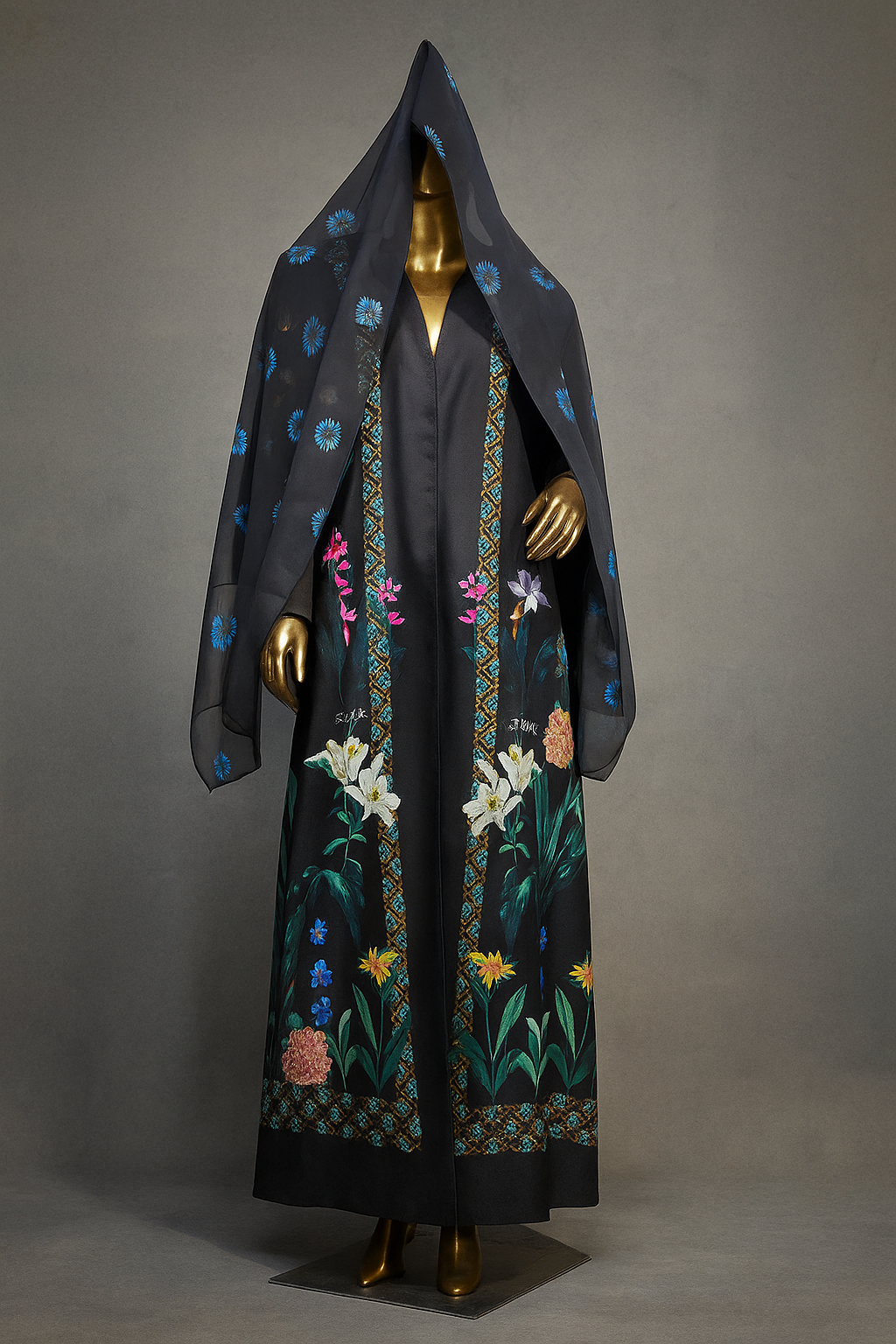 Adorned with vibrant floral embroidery, Intricate geometric borders frame the design.
